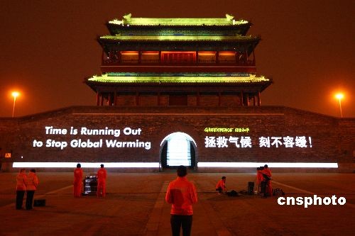 3月23日,在世界氣象日當(dāng)天,國際環(huán)保組織綠色和平在北京永定門城樓啟動(dòng)拯救氣候倒計(jì)時(shí)活動(dòng),希望藉此傳達(dá)世界變暖已經(jīng)迫在眉睫的危機(jī)感。2009年12月,聯(lián)合國氣候變化會(huì)議將在丹麥?zhǔn)锥几绫竟e行,屆時(shí)各國領(lǐng)導(dǎo)人將就未來應(yīng)對氣候變化的全球行動(dòng)簽署協(xié)議。這將是繼2005年生效的《京都議定書》后又一具有劃時(shí)代意義的全球氣候協(xié)議書,將對地球未來的氣候變化產(chǎn)生重要影響。中新社發(fā) 富田 攝