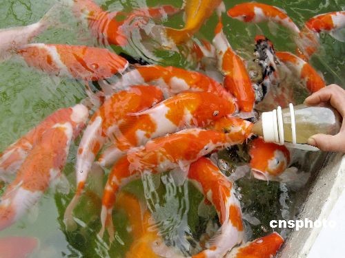 3月25日,在湖北宜昌公園,用奶瓶進食的“吃奶魚”引來許多市民圍觀。該魚是原產(chǎn)日本的錦鯉,壽命在百歲以上,奶瓶裝的是高檔飼料。中新社發(fā) 韓玉洪 攝