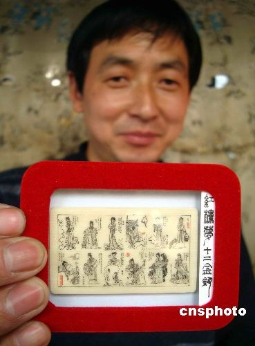 3月26日,郭克杰在蘇州觀前街民間工藝亭展示他在象牙上雕刻的微雕作品“紅樓夢(mèng)十二金釵”。 該象牙微雕作品是郭克杰花費(fèi)近一個(gè)月的時(shí)間創(chuàng)作的,作品長(zhǎng)約5厘米,寬約2.5厘米,十二位人物造型栩栩如生。中新社發(fā) 王建康 攝