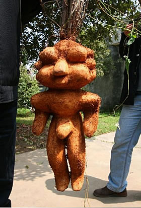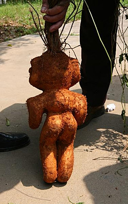 3月25日,江西省上高縣蒙山鄉(xiāng)陂下村一農(nóng)民在野外取土?xí)r,挖出一株根部酷似男性 “人形”神奇植物。該株“人形”植物長約1.25尺(41.6厘米),寬約18厘米,重量約4公斤,人體特征齊全,發(fā)、眼、鼻、耳、嘴、手、腳及男性的生殖器均分明逼真,實屬罕見。據(jù)當?shù)乩现嗅t(yī)和藥品檢驗人員初步鑒定,其為野生何首烏,生長年限至少在百年左在。其型狀最為逼真、體株最大的何首烏在當?shù)剡未發(fā)現(xiàn)過。