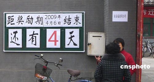 2009年4月2日,北京西長安街拆遷辦旁設(shè)立的獎勵期已進(jìn)入倒計(jì)時第4天。近日,為鼓勵拆遷戶提前搬走,拆遷辦設(shè)立了獎勵期。據(jù)悉,4月6日前簽訂協(xié)議的,每戶給予提前搬家獎勵2.5萬元,重點(diǎn)工程配合獎勵5萬元,合計(jì)7.5萬元。考慮到居民周轉(zhuǎn)的困難,還將對此部分居民給予一次性周轉(zhuǎn)補(bǔ)貼1000元/平方米。4月6日后,未簽訂協(xié)議的被視為放棄獎勵。 截至目前,拆遷范圍內(nèi)的36家單位已全部與拆遷辦簽訂拆遷協(xié)議,大部分單位已開始騰退房屋。而拆遷區(qū)內(nèi)大部分住戶也簽訂了拆遷協(xié)議,部分住戶已購置了兩限房,搬進(jìn)了新家。 中新社發(fā) 玉龍 攝