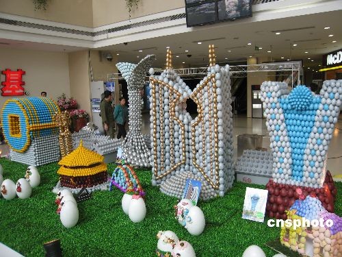 4月11日,沈陽(yáng)一購(gòu)物中心內(nèi)展示出了特殊的沈陽(yáng)城市地標(biāo)建筑群,整個(gè)建筑群占地24平方米,高1.8米,用3萬(wàn)5千個(gè)復(fù)活節(jié)彩蛋搭建而成。這座地標(biāo)群是必勝客聯(lián)合沈陽(yáng)建筑大學(xué)百名師生共同制作完成的,包括沈陽(yáng)故宮大政殿、房地產(chǎn)大廈、方圓大廈、二十一世紀(jì)大廈、百合塔等建筑。中新社發(fā) 沈殿成 攝