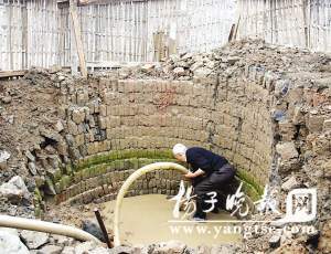 據(jù)悉,古井位置位于六合區(qū)瓜埠地質(zhì)公園西邊1000米的一個(gè)放生池挖掘工地中央。目前數(shù)十臺(tái)施工機(jī)械已停止施工。知情者告訴記者,這里原來(lái)是高近百米、占地50多畝的荒山頭。今年初,當(dāng)?shù)卣鶕?jù)規(guī)劃,打算將這個(gè)荒山開發(fā)成一個(gè)放生魚池,目前,山頭被削平后,已往下挖掘了50多米,這口古井正是挖掘機(jī)司機(jī)在作業(yè)時(shí)無(wú)意間發(fā)現(xiàn)的。