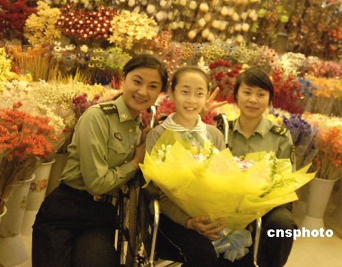 去年汶川大地震中,北川曲山小學(xué)一個(gè)喜歡跳芭蕾舞的十二歲女孩李月在地震中失去左腿,后來在解放軍昆明總醫(yī)院接受治療。4月26日,這名被稱為“芭蕾女孩”的李月來到昆明答謝對(duì)她悉心照顧的醫(yī)生們。圖為4月27日,她在解放軍昆明總醫(yī)院醫(yī)生陪伴下到昆明岔街花市選購鮮花時(shí),與同行的兩名醫(yī)生在花市留影。中新社發(fā) 保旭 攝
