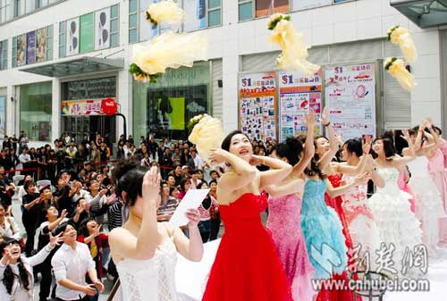 昨日(26日),武昌某商場廣場前,10對甜蜜愛人和他們的親友一起用音樂見證最完美的愛情;顒蝇F(xiàn)場,他們用唱歌的方式將自己從相識、相知、相愛的愛情歷程一一演繹,現(xiàn)場氣氛熱烈,吸引了眾多觀眾駐足圍觀。圖為十名新娘將象征愛情的花球拋向現(xiàn)場的單身男女。