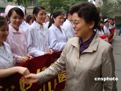 5月8日下午,來自四川省人民醫(yī)院、四川大學(xué)華西醫(yī)院、四川省腫瘤醫(yī)院等20余所醫(yī)院的醫(yī)務(wù)工作者,在抗震救災(zāi)周年期間開赴災(zāi)區(qū)進(jìn)行為期10天的醫(yī)療衛(wèi)生服務(wù)。據(jù)了解,本次醫(yī)務(wù)工作者進(jìn)災(zāi)區(qū)開展醫(yī)療衛(wèi)生服務(wù)分為3個(gè)批次,將在都江堰、青川、北川等極重災(zāi)區(qū)開展醫(yī)療義診、防疫保健、對(duì)口醫(yī)療技術(shù)職員以及抗震救災(zāi)醫(yī)療衛(wèi)生系統(tǒng)先進(jìn)事跡宣傳活動(dòng)。圖為中共四川省委常委李登菊慰問即將開赴災(zāi)區(qū)的醫(yī)療工作者。中新社發(fā) 王萌 攝