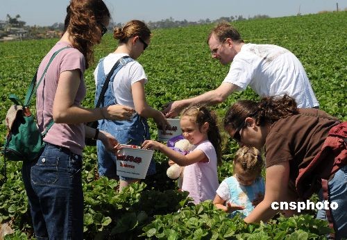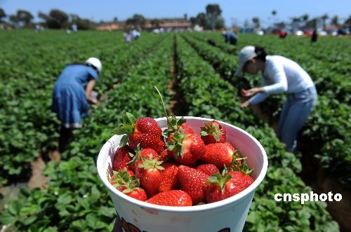 當(dāng)?shù)貢r(shí)間五月二十三日,許多居民來(lái)到加州卡爾斯班的草莓田采摘鮮嫩誘人的草莓。當(dāng)天是美國(guó)陣亡將士紀(jì)念日假期的第一天,通常也是美國(guó)民眾出游的日子。據(jù)美國(guó)汽車(chē)協(xié)會(huì)預(yù)測(cè),盡管遭遇經(jīng)濟(jì)衰退和甲型H1N1流感疫情,但這個(gè)周末仍有三千兩百多萬(wàn)美國(guó)人出游,比去年同期增長(zhǎng)百分之一點(diǎn)五。中新社發(fā) 張煒 攝