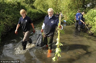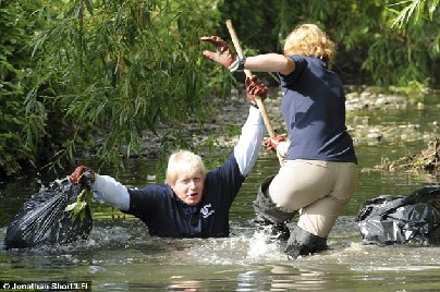 約翰遜當(dāng)時(shí)正在和志愿者們一同為倫敦東南部的普利河清除垃圾,穿著防水長(zhǎng)靴、戴著橡膠手套的他在靠近岸邊的淺水區(qū)忙得不亦樂(lè)乎。在攝像機(jī)面前擺出各種姿勢(shì)后,約翰遜突然被一個(gè)水洼絆倒,并跌倒在河水中。3名志愿者見(jiàn)勢(shì)沖了過(guò)去,用一根竹竿奮力將他拖出水面。