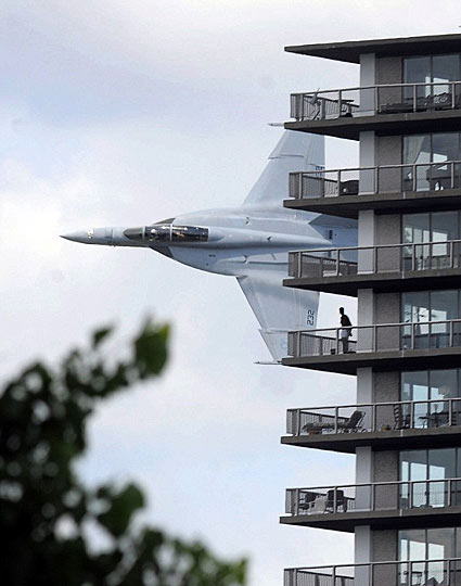 據(jù)英國(guó)媒體7月14日?qǐng)?bào)道,上周末美國(guó)一架海軍F-18戰(zhàn)斗機(jī)低空斜傾地飛過(guò)底特律河旁的一棟公寓樓,引起人們嘖嘖驚嘆。這是迄今為止美國(guó)居民可以最近距離地觀看到海軍F-18戰(zhàn)斗機(jī)的一次。