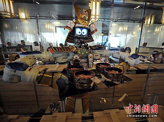 4月1日,在泰國(guó)首都曼谷的一家日本餐館使用機(jī)器人服務(wù)員為顧客端菜。這家日本餐館是泰國(guó)首家擁有機(jī)器人服務(wù)員的餐館,顧客可以通過(guò)電子觸摸屏進(jìn)行點(diǎn)菜,機(jī)器人則會(huì)帶來(lái)相應(yīng)的服務(wù)。機(jī)器人服務(wù)員能有節(jié)奏地跳舞,還可以自動(dòng)到餐桌為客人收走空盤子。