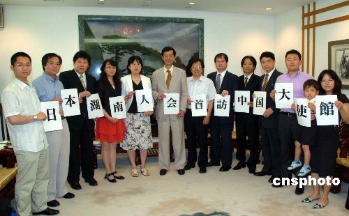 中國(guó)駐日大使館許澤友參贊兼總領(lǐng)事,7月2日下午在大使館會(huì)見(jiàn)了日本湖南之友會(huì)共同代表、日本湖南人會(huì)會(huì)長(zhǎng)段躍中一行,并和日本湖南人會(huì)的副會(huì)長(zhǎng)、理事們進(jìn)行了一個(gè)小時(shí)的座談。許澤友說(shuō),湖南有很深的文化底蘊(yùn),又有豐富的資源,發(fā)展?jié)摿艽。期待在日湖南人為促進(jìn)家鄉(xiāng)、祖國(guó)與日本的交流方面起橋梁和窗口的作用。圖為日本湖南人會(huì)理事和許澤友總領(lǐng)事(左六)、劉敬師領(lǐng)事(右四)合影。中新社發(fā) 段躍中 攝