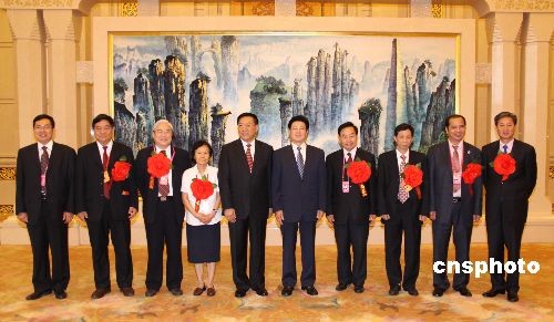 7月14日,全國“僑界十杰”在北京人民大會與全國人大常委會副委員長王兆國、中國僑聯(lián)主席林軍合影。當日,全國“僑界十杰”評選產(chǎn)生,獲選的是:北京華騰東光科技發(fā)展有限公司高級工程師羅益鋒,吉林大學汽車學院教授郭孔輝,福建省光學技術(shù)研究所高級工程師賴愛光,中國科學院海洋研究所研究員鄭守儀,廣東韶關(guān)鋼鐵集團有限公司主任工程師、高級技師羅東元,海南省農(nóng)墾總局副局長、南田農(nóng)場場長彭隆榮,中國科學院院士、世界著名數(shù)學家吳文俊,國家體育總局體操中心副主任、國家級教練黃玉斌,中國航空工業(yè)集團公司北京航空材料研究院高級顧問顏鳴皋,神華集團有限公司總經(jīng)理張玉卓。中新社發(fā) 史利 攝