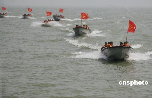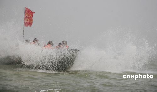 2009年6月13日,安徽巢湖預(yù)備役團(tuán)水上搶險(xiǎn)救災(zāi)分隊(duì)130余人攜12艘沖鋒舟在巢湖水面上擺兵布陣,進(jìn)行水上“S” 形穿越、水上越障、抗洪搶險(xiǎn)救災(zāi)、解救被困群眾、打撈救護(hù)、水上編隊(duì)等科目的實(shí)戰(zhàn)演練,以應(yīng)對(duì)大汛期間各類(lèi)水上搜救。 中新社發(fā) 李遠(yuǎn)波 攝