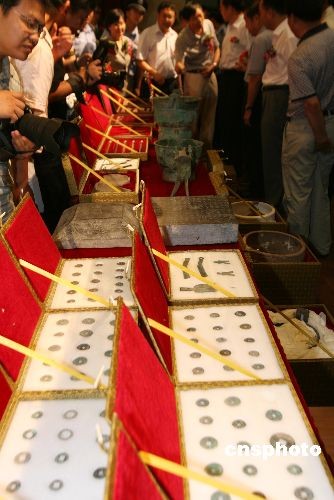 7月14日上午,河南省文物局和安陽(yáng)市在河南博物院多功能廳舉行河南省征調(diào)文物入藏儀式,將河南博物院和河南省文物考古研究所收藏的193件有關(guān)文字的文物移交中國(guó)文字博物館收藏。這批移交的文物包括河南博物院藏“十六年鄭令”戈、銅“部曲將”印、曾子甗等123件文物和河南省文物考古研究所藏的賈湖龜腹甲刻符、新蔡葛陵楚墓竹簡(jiǎn)、溫縣盟書(shū)、長(zhǎng)子口鼎、、薳子昃鼎、平夜君成戈、垂球等不同歷史時(shí)期的各門(mén)類(lèi)文物70件。中新社發(fā) 王中舉 攝
