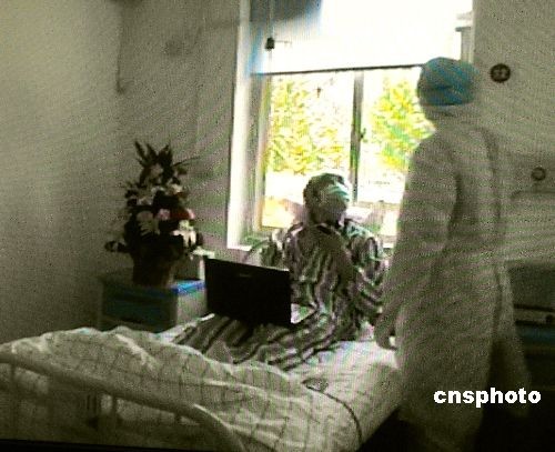 五月十三日中午,在山東省城濟南市傳染病醫(yī)院接受治療的輸入性甲型H1N1流感疑似患者呂某某目前身體、精神各情況已基本恢復(fù)。疑似患者呂某某在十一日晚剛從濟南火車站下車時體溫一度高達三十八點九攝氏度。經(jīng)過濟南市傳染病醫(yī)院的醫(yī)護治療,體溫已降至三十六點七攝氏度。圖為記者從醫(yī)院監(jiān)控系統(tǒng)的電視屏幕上拍到的患者正在與醫(yī)生交談。中新社發(fā) 張璐 攝