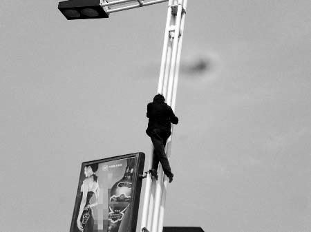 5月16日14時45分,許昌市(河南)消防支隊(duì)禹州大隊(duì)接到報警,位于禹州市濱河路東段歐蔓咖啡廳對面一路燈桿上有人要自殺。消防官兵趕到現(xiàn)場發(fā)現(xiàn),一名約40歲左右,操外地口音的男子在路燈桿頂部,一會兒躺在路燈桿頂部的燈罩架上做出睡覺姿勢,一會兒抓住燈罩架蕩起“秋千”。