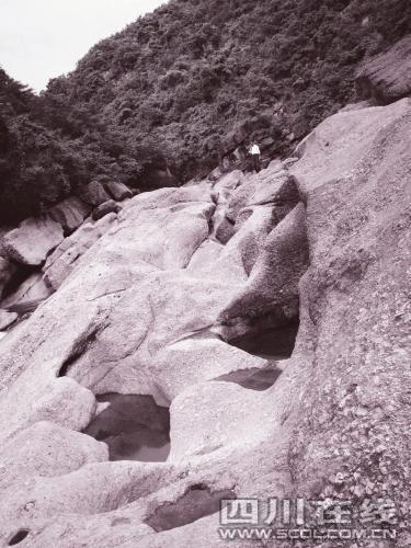 專家推測(cè),冰川運(yùn)動(dòng)在這里形成了一個(gè)很大的冰床,冰水滴水穿石,形成一個(gè)個(gè)圓圓的冰臼!(張發(fā)政 高志農(nóng))