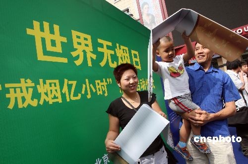 5月29日,一個(gè)家庭在北京王府井大街將香煙模型撅斷,這是由北京市愛衛(wèi)會(huì)主辦的世界無煙日暨“戒煙億小時(shí)”公益活動(dòng)現(xiàn)場。該活動(dòng)發(fā)出“戒煙一小時(shí),健康億人行”的戒煙口號(hào),號(hào)召“世界無煙日”(5月31日)當(dāng)天17點(diǎn)31分至18點(diǎn)31分之間戒煙一小時(shí)。據(jù)悉,中國是世界上煙草生產(chǎn)和消費(fèi)第一大國,目前約有3.5億吸煙者,并且還在以每年300萬的速度增長,控?zé)熜蝿輼O為嚴(yán)峻。中新社發(fā) 張宇 攝
