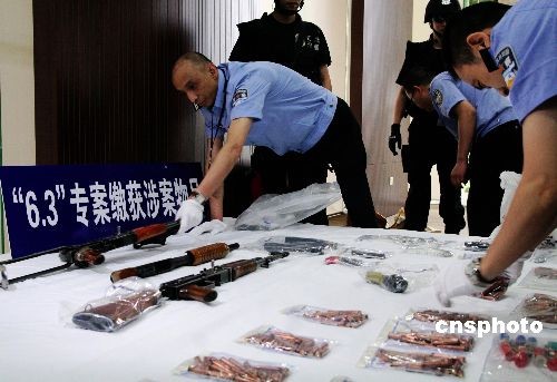 6月15日,重慶市公安局向媒體通報(bào),當(dāng)月3日發(fā)生在重慶主城區(qū)的槍擊案已告破。警方抓獲直接參與持槍殺人的3名罪犯,還通過偵破此案發(fā)現(xiàn)和擴(kuò)大線索,一舉抓獲50多名涉槍、涉黑和涉惡等犯罪的嫌疑人,繳獲兩支56沖鋒槍、一支唧筒式獵槍、一支德國(guó)造PP手槍、一支仿制手槍和一枚手雷、一副手銬及439發(fā)各類子彈。圖為重慶警方在整理繳獲的涉案物品。中新社發(fā) 郭虹 攝