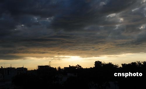 6月26日早晨5時(shí),2009年第4號(hào)熱帶風(fēng)暴“浪卡”(NANGKA)的中心位于東沙島偏南方大約220公里的南海東北部海面上,中心附近最大風(fēng)力有8級(jí)(20米/秒)。預(yù)計(jì),風(fēng)暴中心將以每小時(shí)15-20公里的速度向西北方向移動(dòng),將于6月26日夜間到27日上午在廣東惠來(lái)到珠海一帶沿海登陸,登陸后強(qiáng)度迅速減弱。中新社發(fā) 蒙鐘德 攝