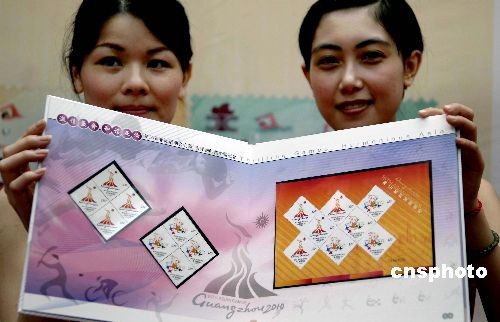 6月30日,在廣州亞運會倒計時500天之際,由第16屆亞運會組委會授權、中國郵政發(fā)行的廣州亞運會首套紀念郵票《第16屆亞洲運動會》在廣州舉行首發(fā)儀式。該套紀念郵票共兩枚,圖案分別為廣州亞運會的會徽和吉祥物,采用五色影寫版印刷方式,由中國著名郵票設計家方軍設計,畫面將嶺南文化元素與亞運元素融為一體,具濃郁嶺南氣息。中新社發(fā) 劉衛(wèi)勇 攝