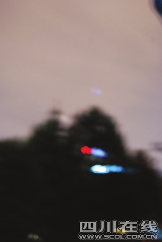 昨(7月2日)晚8點(diǎn)30分左右,成都磨子巷上空出現(xiàn)不明飛行物,附近上千市民從家中跑出,到陽(yáng)臺(tái)或街上觀望:夜幕中有一藍(lán)色光團(tuán)如圓月大小,靜靜觀看時(shí),可發(fā)現(xiàn)該光團(tuán)藍(lán)紅光交替,向西南方向緩慢移動(dòng)(如圖)。該現(xiàn)象持續(xù)至9點(diǎn)50左右結(jié)束,成都市飛碟協(xié)會(huì)秘書長(zhǎng)楊佛章初步猜測(cè),是涂有發(fā)光材料的風(fēng)箏等物品造成的。