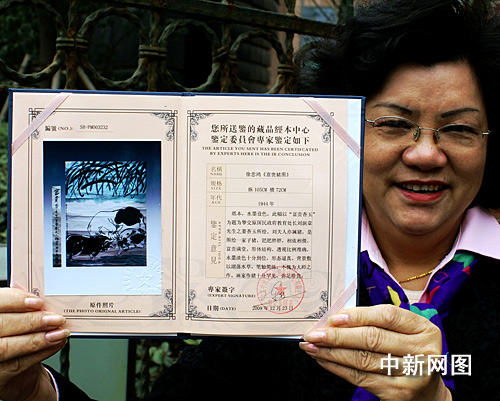 在2009年12月底,這幅畫送權(quán)威機(jī)構(gòu)北京中博文物檢測鑒定中心鑒定,經(jīng)資深文物鑒定專家陳行一先生鑒定,確認(rèn)為徐悲鴻大師的真跡。陳行一在鑒定意見中還寫道:“劉夫人亦屬豬,是圖繪一家子豬,肥肥胖胖,相依相偎,富貴滿堂。形體結(jié)構(gòu)、透視比例準(zhǔn)確,水墨淡色十分到位,形態(tài)逼真。背景敷以湖蕩水草,筆觸簡練,不愧為大師之作。畫家作豬十分罕見,彌足珍貴!