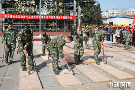 中新網(wǎng)連云港3月10日電 (蘇欣 吳茂新 朱曉穎)10日上午,在連云港市消防支隊(duì)營(yíng)區(qū)院內(nèi),由消防部門(mén)聯(lián)合工商、質(zhì)監(jiān)共同查獲的不合格滅火器、消火栓、消防應(yīng)急照明燈等520余件消防假冒偽劣產(chǎn)品被集中銷毀。
