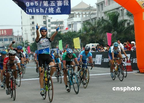 十一月八日,“海馬汽車”二00七環(huán)海南島國際公路自行車賽進(jìn)行第五賽段儋州至東方一百六十八公里的比賽,波蘭隊(duì)四號(hào)車手羅伯特·仁多士(前左二)獲得本賽段冠軍。中新社發(fā) 尹海明 攝