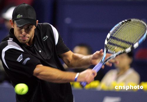 11月12日,在2007上海網(wǎng)球大師杯賽紅組首場單打比賽中,美國“火箭小子”羅迪克戰(zhàn)勝世界排名第4的俄羅斯選手達維登科,迎來本屆大師杯開門紅。中新社發(fā) 湯彥俊 攝