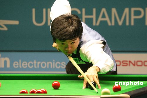 當(dāng)?shù)貢r(shí)間12月11日晚,中國“臺(tái)球神童”丁俊暉在英國的泰爾福德,以九比五力挫被戲稱為“00七”的奈吉爾·邦德,成功晉級(jí)斯諾克英國錦標(biāo)賽八強(qiáng)。中新社發(fā) 李鵬 攝
