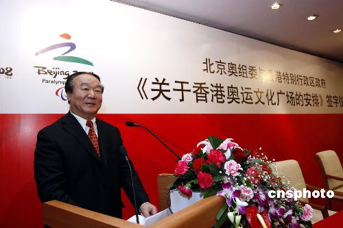 12月22日,北京奧組委與香港特別行政區(qū)政府就《關(guān)于香港奧運(yùn)文化廣場(chǎng)的安排》在北京簽署協(xié)議。北京奧組委執(zhí)行副主席蔣效愚與香港特區(qū)政府康樂(lè)及文化事務(wù)署署長(zhǎng)周達(dá)明代表雙方簽字。香港奧運(yùn)文化廣場(chǎng)將選擇交通便利的露天場(chǎng)所、休閑開(kāi)闊地或公園內(nèi)開(kāi)展活動(dòng),設(shè)立電視大屏幕觀看奧運(yùn)會(huì)比賽,舉辦文藝演出、主題展覽等,并對(duì)公眾免費(fèi)開(kāi)放。這項(xiàng)活動(dòng)預(yù)計(jì)將從北京奧運(yùn)會(huì)開(kāi)幕時(shí)啟動(dòng),至殘奧會(huì)閉幕時(shí)結(jié)束。圖為北京奧組委執(zhí)行副主席蔣效愚致辭。中新社發(fā) 杜洋 攝
