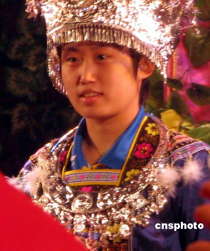 12月24日晚,2007年國際女子乒乓球對抗賽在廣西柳州拉開帷幕。賽前所有運動員都身穿當?shù)氐拿褡宸b亮相。中新社發(fā) 周瀟男 攝