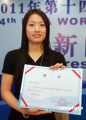 1月31日,泳壇名將羅雪娟成為2011年第14屆國際泳聯(lián)世界錦標(biāo)賽形象大使。當(dāng)日,2011年第14屆國際泳聯(lián)世界錦標(biāo)賽組委會在上海正式成立,此舉標(biāo)志著將于2011年7月在上海舉行的該項賽事的籌備組織工作正式啟動。中新社發(fā) 湯彥俊 攝
