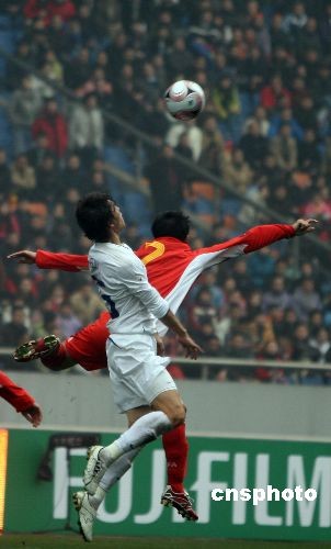 2月17日,2008東亞足球錦標(biāo)賽揭幕戰(zhàn)在中國重慶打響,中國男子足球隊(紅衣)仍未打破“恐韓”魔咒,終場前約兩分鐘被韓國隊攻入制勝一球,以2:3惜敗。中新社發(fā) 郭晉嘉 攝