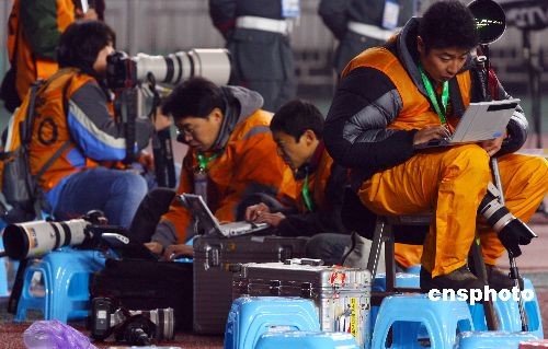 2月17日,2008東亞足球錦標(biāo)賽揭幕戰(zhàn)在中國(guó)重慶打響。揭幕戰(zhàn)中,中國(guó)隊(duì)未能打破“恐韓”魔咒,以2:3惜敗于韓國(guó),日本則與朝鮮隊(duì)1:1戰(zhàn)平,中國(guó)隊(duì)排名暫時(shí)位居末位。圖為球賽中場(chǎng)休息時(shí),記者們?cè)趫?chǎng)邊爭(zhēng)分奪秒發(fā)稿。中新社發(fā) 郭晉嘉 攝