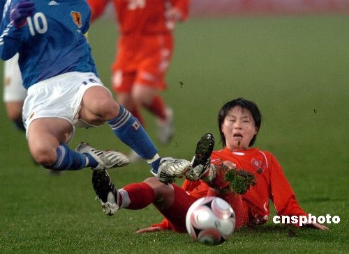 2008年2月18日,東亞女子足球錦標(biāo)賽在重慶永川體育中心體育場(chǎng)開戰(zhàn)。日本隊(duì)以3比2勝朝鮮隊(duì),爆出本賽事一冷門。中新社發(fā) 吳峻 攝