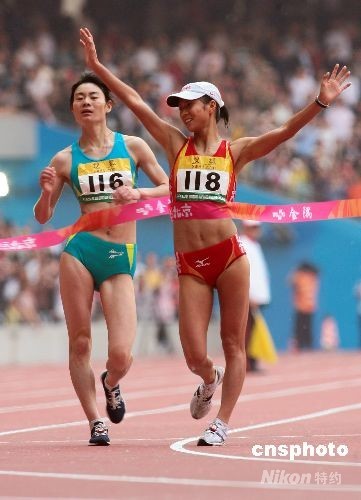4月18日,好運北京2008國際田聯(lián)競走挑戰(zhàn)賽在國家體育場“鳥巢”進行,這是“鳥巢”建成以來舉辦的首場賽事,在當天下午進行的女子20公里競走比賽中,中國選手劉虹(右)以1小時29分33秒的成績摘得冠軍,這也是“鳥巢”投入使用后中國選手獲得的第一個冠軍。中新社發(fā) 富田 攝