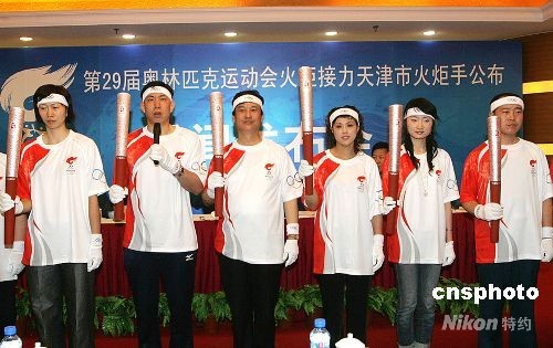 4月30日,北京第29屆奧林匹克運(yùn)動(dòng)會(huì)火炬接力天津市火炬手名單公布。全國(guó)勞動(dòng)模范孔祥瑞(左三),當(dāng)代著名作家和畫(huà)家馮驥才,天津女排主教練王寶泉,奧運(yùn)會(huì)排球冠軍張娜、李珊等入選。將參加天津地區(qū)火炬接力的共有416名火炬手和85名護(hù)跑手,年齡最大的七十九歲,最小的十四歲。中新社發(fā) 孫震 攝