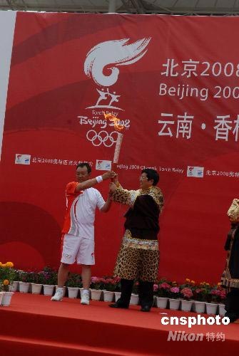 6月11日9時20分,奧運圣火在云南香格里拉開始傳遞,香格里拉縣縣長肖徐(右)把首棒火炬交給藏族火炬手馬八金,這是奧運圣火首次在中國藏區(qū)傳遞。中新社發(fā) 石雨 攝