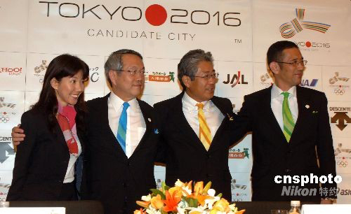 8月4日,東京2016年奧運(yùn)會(huì)申辦委員會(huì)在北京舉辦東京申辦2016年奧運(yùn)會(huì)新聞發(fā)布會(huì)。圖為日本奧林匹克委員會(huì)主席、東京2016年奧運(yùn)會(huì)申辦委員會(huì)副主席竹田恒和(右三)、東京2016年奧運(yùn)會(huì)申辦委員會(huì)主席兼首席執(zhí)行官河野一朗(右二)、東京都政府申辦推廣部執(zhí)行總監(jiān)中村年長(zhǎng)(右一)、東京2016年奧運(yùn)會(huì)申辦委員會(huì)國(guó)際宣傳部總監(jiān)仲川美穗子(左一)在會(huì)上合影。中新社發(fā) 鄒憲 攝