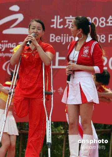 九月一日,北京殘奧會(huì)助威團(tuán)形象大使金晶(左),在上海助陣殘奧會(huì)火炬接力活動(dòng)。當(dāng)日,北京殘奧會(huì)火炬接力“時(shí)代風(fēng)采線”第三站傳遞活動(dòng),在上海松江新城大學(xué)園區(qū)進(jìn)行,共有六十名火炬手參加。其中,殘疾人員有10名,其余為助殘、幫殘的先進(jìn)代表和基層殘疾人事業(yè)工作者。中新社發(fā) 湯彥俊 攝
