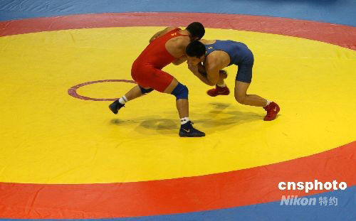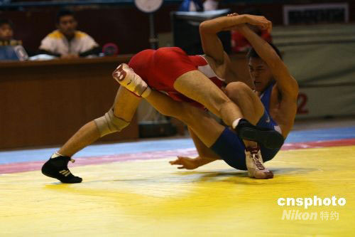 9月27日,運動員在進行自由式摔跤比賽。當日,全國男子自由式摔跤冠軍賽在河南許昌開賽,來自全國各地的340余名運動員在為期3天的比賽中展開角逐,比賽采用單敗淘汰全復活賽制,分別進行資格賽、淘汰賽等。本次摔跤比賽由國家體育總局舉摔柔運動管理中心主辦,河南省體育局和許昌市體育局承辦。中新社發(fā) 牛書培 攝