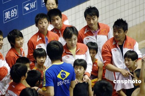 10月18日,奪得北京奧運7金1銀3銅的中國跳水“夢之隊”成員郭晶晶、吳敏霞、何沖等在福州給小跳水運動員傳授技藝。當(dāng)日,2008全國跳水錦標賽在福建省體育中心游泳跳水館開賽。中新社發(fā) 王東明 攝