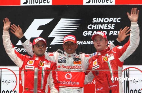 2008賽季F1第17站中國(guó)大獎(jiǎng)賽10月19日在上海國(guó)際賽車(chē)場(chǎng)結(jié)束,邁凱輪車(chē)隊(duì)漢密爾頓奪得冠軍,法拉利車(chē)隊(duì)馬薩(左)、萊科寧奪得亞、季軍。中新社發(fā) 趙振清 攝