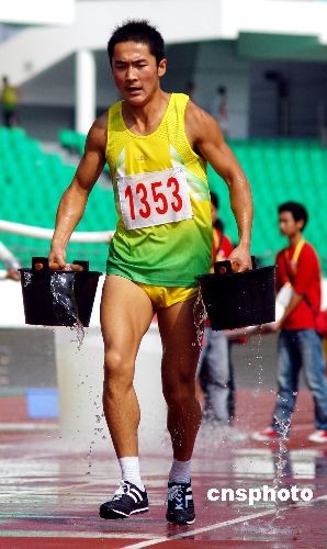 十月三十日,第六屆全國農民運動會田徑比賽在福建泉州海峽體育中心拉開帷幕后,進行了男子5分鐘50米抗旱提水保苗賽跑比賽,這是一項考驗運動員耐力和技巧的項目,最后一分鐘,是運動員體力的大考驗。中新社發(fā) 傅丹丹 攝