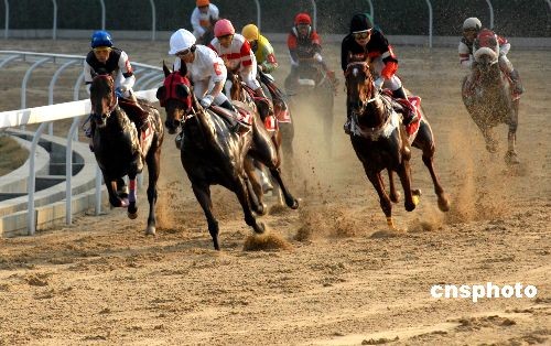 11月26日,2008全國(guó)速度賽馬錦標(biāo)賽在湖北武漢市“東方馬城”揚(yáng)鞭開(kāi)賽。當(dāng)日下午,分別進(jìn)行了1000米純血馬2個(gè)組和1800米無(wú)限定馬2個(gè)組的預(yù)賽,總決賽將于本月30日進(jìn)行。據(jù)了解,本次賽事吸引了包括解放軍代表隊(duì)在內(nèi)的來(lái)自全國(guó)20支代表隊(duì)80多名騎師和120余匹賽馬參加。中新社發(fā) 楚天行 攝