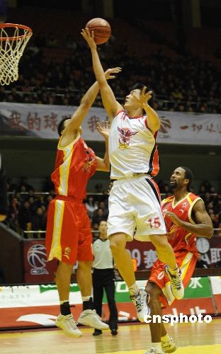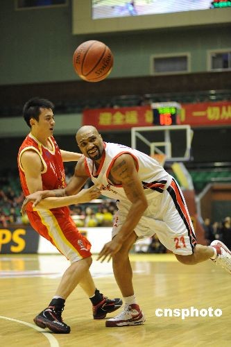 12月5日,2008—2009賽季CBA聯(lián)賽第九輪在山東濟(jì)南的一場(chǎng)比賽中,主場(chǎng)作戰(zhàn)的山東黃金隊(duì)以108比78戰(zhàn)勝青島雙星隊(duì)。中新社發(fā) 張侃 攝