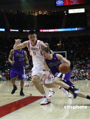 當(dāng)?shù)貢r間2月11日,火箭隊(duì)在休斯頓豐田中心以94-82擊敗阿帥舊部——聯(lián)盟倒數(shù)第一的國王,贏得了全明星賽前的最后一場比賽。姚明全場貢獻(xiàn)了24分18個籃板,均為全場最高。中新社發(fā) 歐文 攝