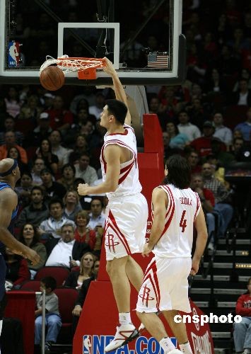 當(dāng)?shù)貢r(shí)間二月二十日晚,NBA火箭隊(duì)在休斯頓主場(chǎng)迎戰(zhàn)小牛隊(duì),以93比86逆轉(zhuǎn)獲勝。中國球員姚明拿下了22分13個(gè)籃板。圖為姚明扣籃得分。中新社發(fā) 歐文 攝